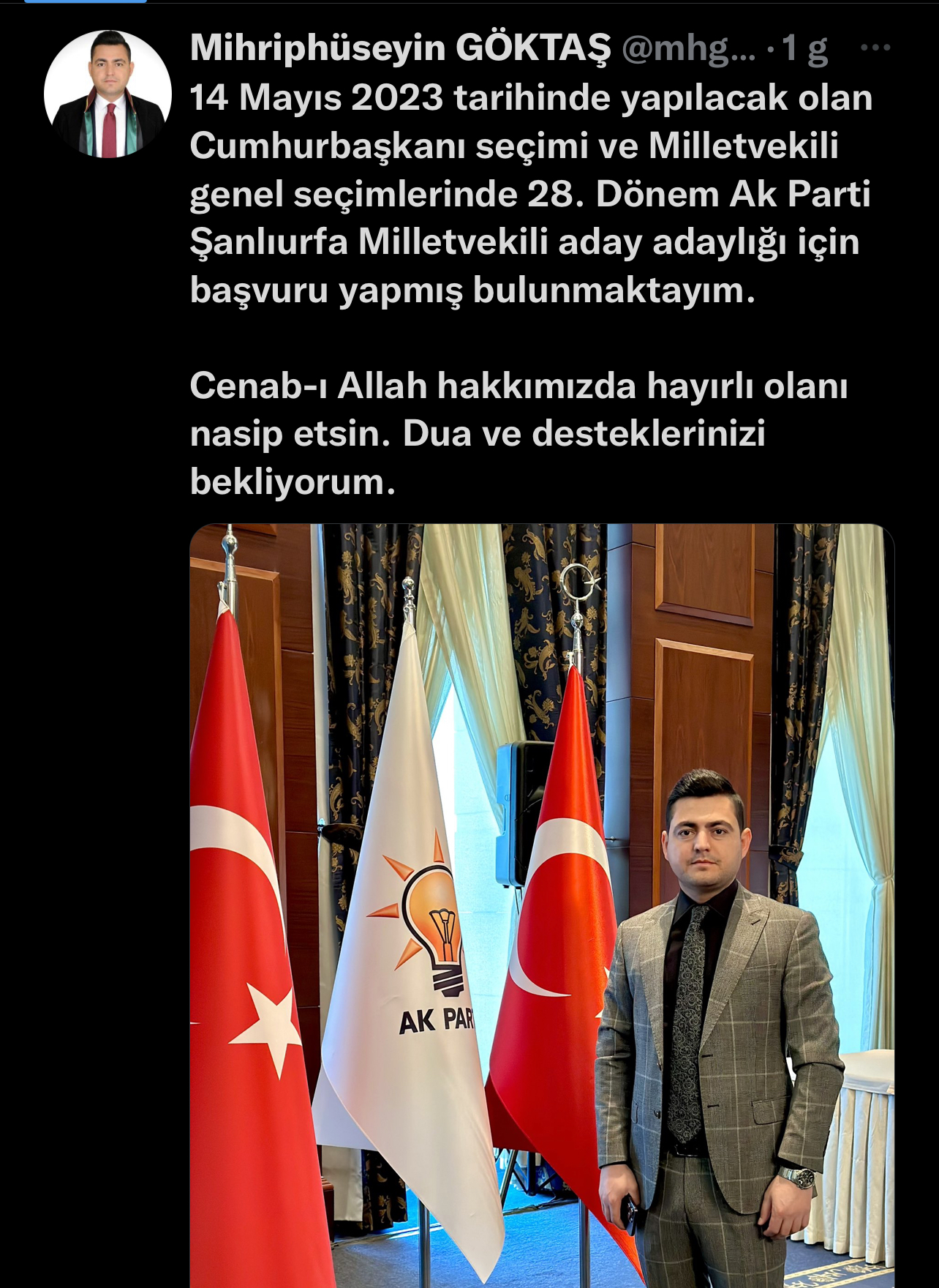 Şanlıurfa’da milletvekili aday adayı başvuruları devam ediyor. AK Parti Şanlıurfa milletvekilliğine şimdiye kadar 227 kişi müracaat etti. Göktaş ailesine mensup avukat Mihrip Hüseyin Göktaş, AK Parti Şanlıurfa milletvekili aday adaylığına başvuru yaptı. AK Parti Şanlıurfa Milletvekili Aday Adayı Mihrip Hüseyin Göktaş, sosyal medyadan yaptığı açıklamada şunları kaydetti; "14 Mayıs 2023 tarihinde yapılacak olan Cumhurbaşkanı seçimi ve Milletvekili genel seçimlerinde 28. Dönem Ak Parti Şanlıurfa Milletvekili aday adaylığı için başvuru yapmış bulunmaktayım.Cenab-ı Allah hakkımızda hayırlı olanı nasip etsin. Dua ve desteklerinizi bekliyorum."