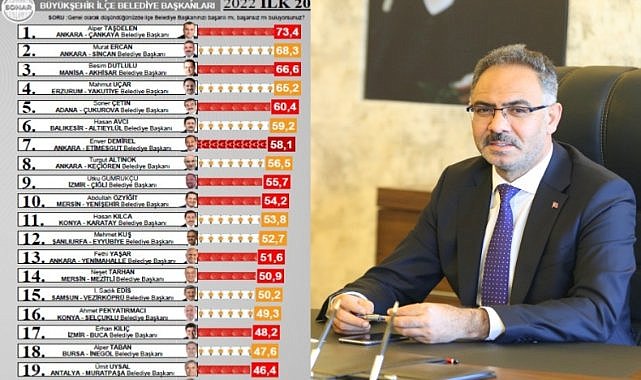 Seçildiği 2019 yılından bu yana gerek halk içindeki etkinliği, gerekse kamusal hizmetlerinde verimliliğin sağlanmasını temin etmesi nedeniyle seçmenin gönlündeki yerini koruyan Şanlıurfa Eyyübiye Belediye Başkanı Mehmet Kuş, yapılan tüm kamuoyu araştırmalarında başarılı bulundu. Başkan Kuş, son olarak Sonar Araştırma Şirketi’nin yaptığı 2022 Yılının En Başarılı Belediye Başkanları araştırmasında, İstanbul Hariç 2022 Yılının En Başarılı Büyükşehir İlçe Belediye Başkanları içinde 12’nci sırada yer aldı. “Genel olarak düşünüldüğünde ilçe Belediye Başkanımızı başarılı mı, başarısız mı buluyorsunuz?” sorusunun yöneltildiği araştırmaya Eyyübiye ilçesinden katılanların yüzde 52,7’si Başkan Kuş’u başarılı bulduğunu ifade etti. Sonar Araştırma Şirketi’nin Aralık ayında yaptığı 2022 yılının son araştırmasında, İstanbul Hariç 2022 Yılının En Başarılı Büyükşehir İlçe Belediye Başkanları listesinin ilk 20 ismi arasında Ankara Çankaya Belediye Başkanı Alper Taşdelen ilk sırada yer alırken, Eyyübiye Belediye Başkanı Mehmet Kuş 12’nci, Kayseri Melikgazi Belediye Başkanı Mustafa Palancıoğlu ise 20’nci sırada yer aldı. 1990 yılında DYP’nin seçimlerden birinci parti olarak çıkacağını tespit ederek Türkiye’deki kamuoyu araştırmalarındaki isabetli tespitlerine başlayan Sonar Araştırma Şirketi, 2019 yılına kadar olan tüm seçimlerin sonuçlarını da tam isabetle belirlemişti.