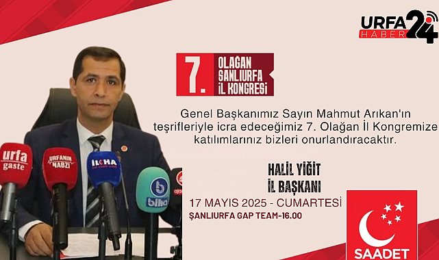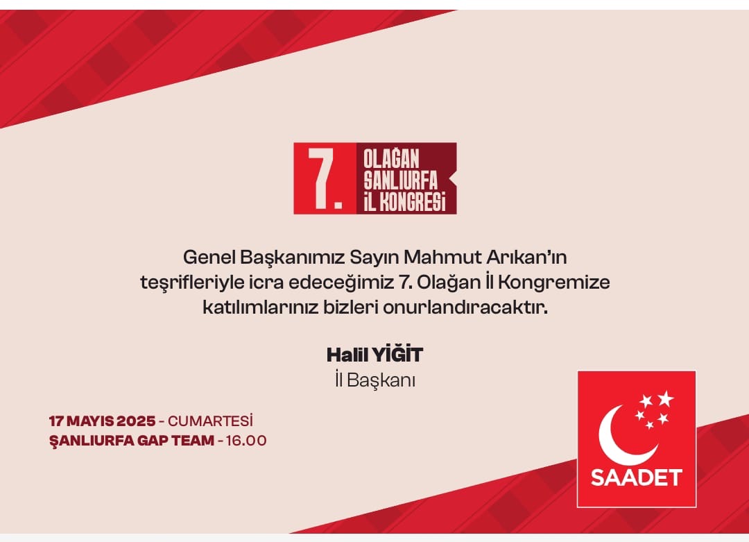 Konuya ilişkin açıklamada bulunan İl Başkanı Halil Yiğit, “Genel Başkanımız Sayın Mahmut Arıkan’ın teşrifleriyle icra edeceğimiz 7. Olağan İl Kongremize tüm halkımızı davet ediyor, katılımlarının bizleri onurlandıracağını ifade etmek istiyorum” dedi.Kongre, Saadet Partisi’nin Şanlıurfa’daki teşkilat yapısını güçlendirmeyi ve bölge halkıyla bütünleşmeyi hedefliyor.Tarih: 17 Mayıs 2025 – Cumartesi