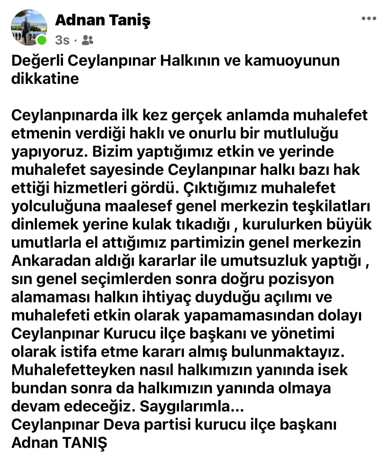 DEVA Partisi Ceylanpınar İlçe Başkanı Adnan Tanış ve Gençlik Kolları Başkanı Mahmut İLİNGİ başta olmak üzere tüm ilçe yönetim kurulu üyeleri istifa etti. ilçe Başkanı Adnan Tanış sosyal medya üzerinde şu paylaşımda bulundu;"Değerli Ceylanpınar Halkının ve kamuoyunun dikkatine Ceylanpınarda ilk kez gerçek anlamda muhalefet etmenin verdiği haklı ve onurlu bir mutluluğu yapıyoruz. Bizim yaptığımız etkin ve yerinde muhalefet sayesinde Ceylanpınar halkı bazı hak ettiği hizmetleri gördü. Çıktığımız muhalefet yolculuğuna maalesef genel merkezin teşkilatları dinlemek yerine kulak tıkadığı , kurulurken büyük umutlarla el attığımız partimizin genel merkezin Ankaradan aldığı kararlar ile umutsuzluk yaptığı , sın genel seçimlerden sonra doğru pozisyon alamaması halkın ihtiyaç duyduğu açılımı ve muhalefeti etkin olarak yapamamasından dolayı Ceylanpınar Kurucu ilçe başkanı ve yönetimi olarak istifa etme kararı almış bulunmaktayız. Muhalefetteyken nasıl halkımızın yanında isek bundan sonra da halkımızın yanında olmaya devam edeceğiz. Saygılarımla…