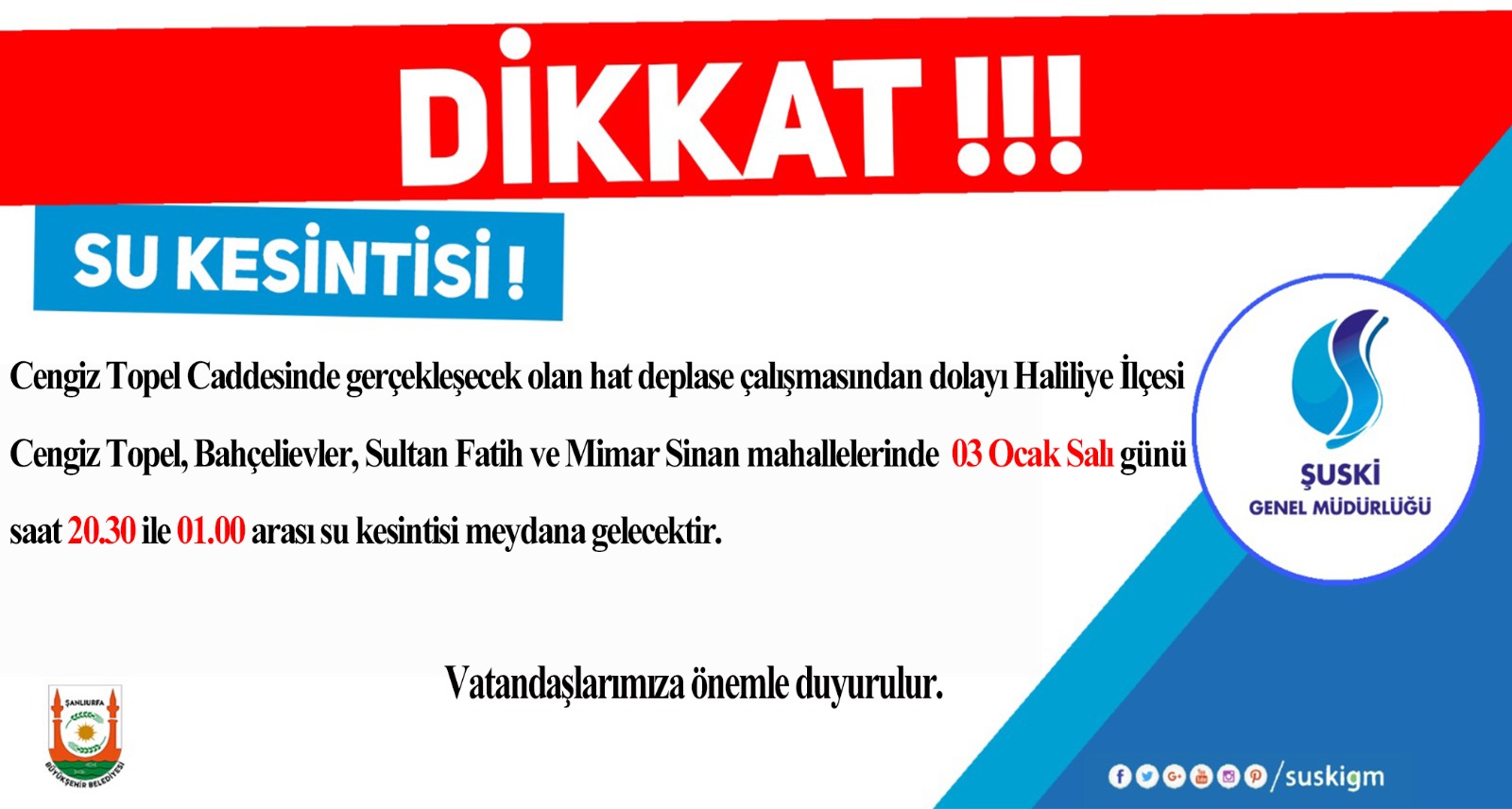 ŞUSKİ'den yapılan açıklamaya göre, hat deplase çalışmasından dolayı ilçede 4 mahallede su kesintisi yaşanacak.Açıklamada, “Cengiz Topel Caddesinde gerçekleşecek olan hat deplase çalışmasından dolayı Haliliye ilçesi Cengiz Topel, Bahçelievler, Sultan Fatih ve Mimar Sinan mahallelerinde 3 Ocak Salı günü saat 20.30 ile 01.00 arası su kesintisi meydana gelecektir. Vatandaşlarımıza önemle duyurulur.” İfadelerine yer verildi.