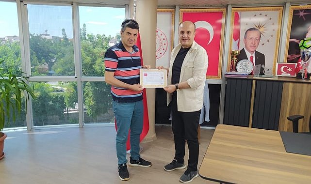 Foto: İmamoğlu, Gençlik ve Spor İl Müdürü Halil Eren'in elinden başarı belgesini alırken.