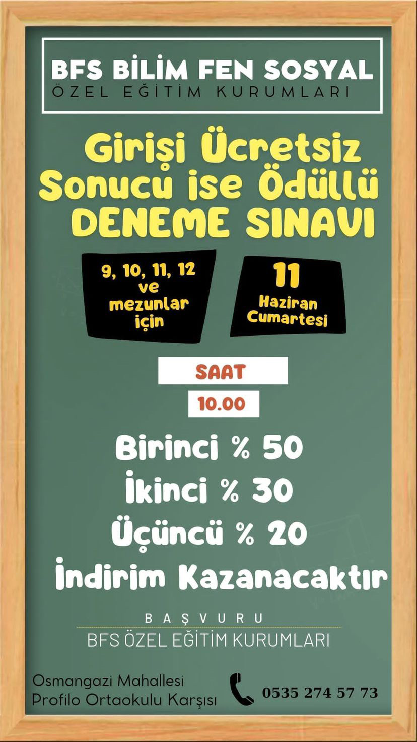 BFS Bilim Fen Sosyal Özel Eğitim Kurumları 'Giriş ücretsiz, sonucu ise ödüllü deneme sınavı' adı altın öğrencilere ücretsiz denme sınavı imkanı sunuyor.