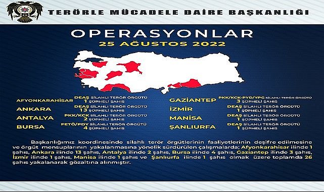 Emniyet Genel Müdürlüğü Terörle Mücadele Daire Başkanlığı aralarında Şanlıurfa’nın da bulunduğu 8 ilde eş zamanlı operasyonlar gerçekleştirdi. Gerçekleştirilen operasyonlarda 26 şüpheli gözaltına alındı.Ülke genelinde terörle mücadele aralıksız bir şekilde devam ediyor. Bu mücadele kapsamında Terörle Mücadele Daire Başkanlığı koordinesinde Şanlıurfa, Afyonkarahisar, Ankara, Antalya, Bursa, Gaziantep, İzmir ve Manisa’da operasyonlar düzenlendi. Operasyonlarda toplamda 26 kişi yakalandı.Şanlıurfa’da yakalanan zanlının terör örgütü DEAŞ üyesi olduğu iddia edildi.