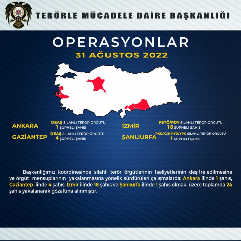 Terörle Mücadele Daire Başkanlığı’ndan yapılan son açıklamaya göre Şanlıurfa’da PKK/KCK-PYD/YPG terör örgütü şüphelisi 1 kişi yakalanarak gözaltına alındı. Terörle Mücadele Daire Başkanlığı tarafından yapılan açıklamada, “Başkanlığımız Koordinesinde silahlı terör örgütlerinin faaliyetlerinin deşifre edilmesine ve örgüt mensuplarının yakalanmasına yönelik sürdürülen çalışmalarda; Ankara’da 1 şahıs, Gaziantep’te 4 şahıs İzmir’de 18 şahıs ve Şanlıurfa’da 1 Şahıs olmak üzere toplamda 24 şahıs yakalanarak gözaltına alınmıştır. “denildi.