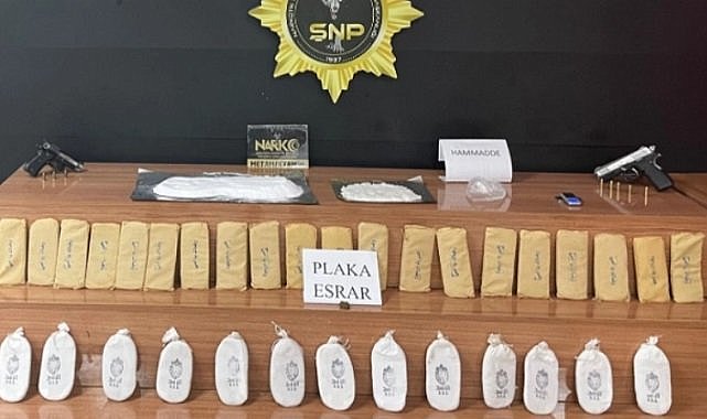 Şanlıurfa İl Emniyet Müdürlüğü Narkotik Suçlarla Mücadele Şubesi ekipleri, Kent merkezinde belirlenen adrese operasyon düzenledi.Adreste yapılan aramada 6 kilo 105 gram esrar, 1 kilo 98 gram sentetik uyuşturucu ile 2 ruhsatsız tabanca ve bir hassas terazi ele geçirildi.Gözaltına alınan 4 zanlı, işlemleri için emniyet müdürlüğüne götürüldü.