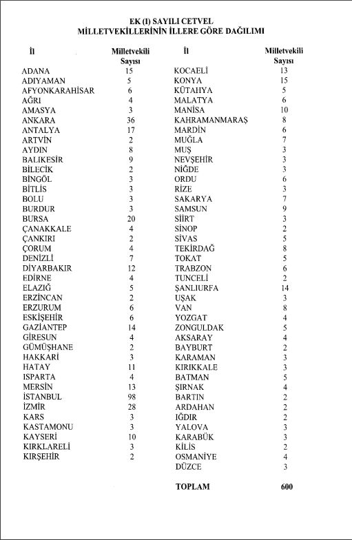 Resmi Gazete'nin bugünkü sayısında YSK Başkanlığı tarafından yayımlanan kararda, Türkiye Büyük Millet Meclisi'nde görev yapacak 600 milletvekilinin illere göre dağılımı belirlendi.