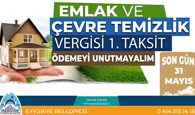 Eyyübiye Belediyesi İşletme ve İştirakler Müdürlüğü, 2022 yılı Emlak ve Çevre Temizlik Vergisi ilk taksit ödemelerinde son günün 31 Mayıs 2022 olduğunu duyurarak, vatandaşların mağdur olmaması için son günü beklemeden ödemelerini yapmalarını istedi.
