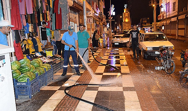 Akşam saatlerinde başlayan ve gece geç saatlere kadar devam eden çalışma çerçevesinde kirlenen cadde ve kaldırımlar tazyikli suyla yıkanarak, temiz hale getirildi.